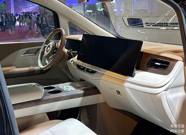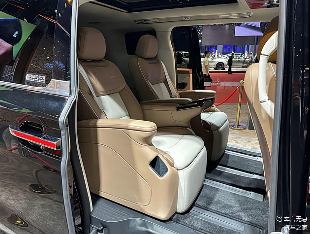 第二排座椅使用了全新的造型,靠背带有祥云纹理装饰,车顶是全景天窗,还提供了车顶电视以及后排冰箱。