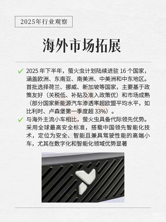 例如,比利时与卢森堡2025年第一季度新能源渗透率超33%,反映了消费者对电动车的接受度与市场需求潜力。这些成熟市场不仅具备较高的购买力,还拥有完善的充电与服务网络,为萤火虫的快速落地提供了保障。