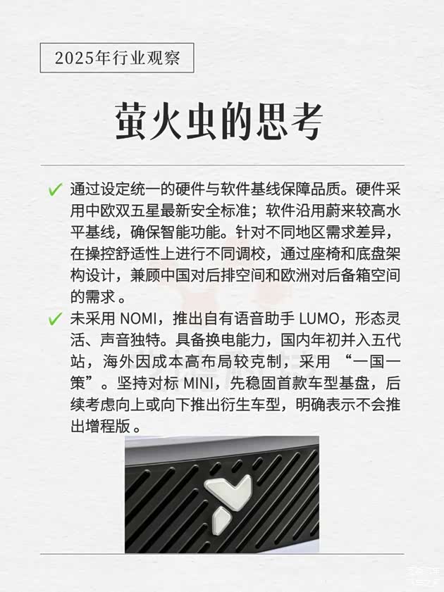 ◎ 而在海外,萤火虫灵活选择直营或经销商模式。例如,在挪威等直营体系成熟的国家,萤火虫可直接复用蔚来的品牌资源;而在西欧等市场,萤火虫通过与当地经销商合作,借助其深厚的客户关系与市场网络,快速提升品牌认知度。
