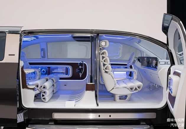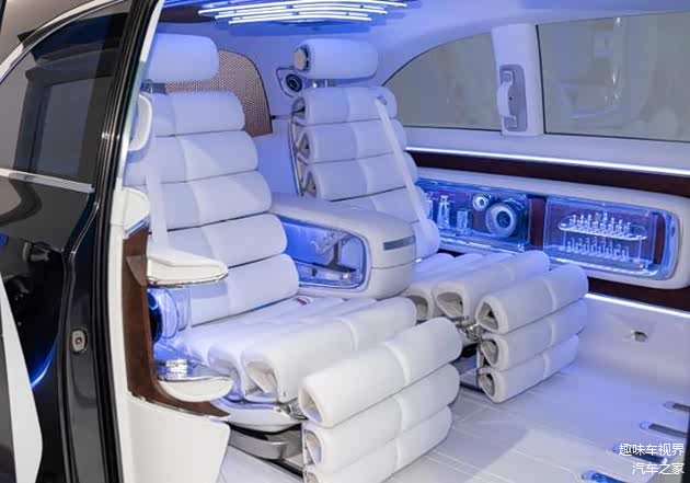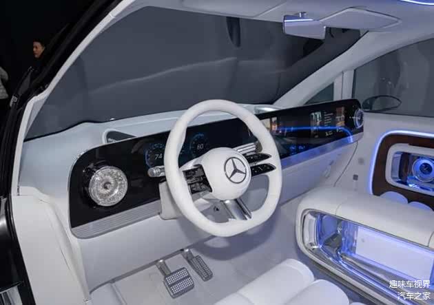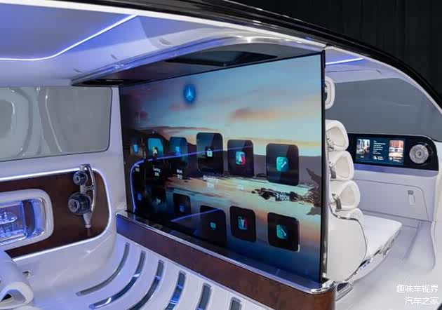 进入车内,奔驰Vision V概念车的内饰设计将豪华与科技完美融合。车内采用浅色为主的色调,搭配木饰、白色 Nappa 皮革和白色丝绸等材质,营造出温馨舒适的氛围。中控台采用直立式左右贯穿大屏,整合了液晶仪表盘、中控屏与副驾驶娱乐屏,提供了连贯且震撼的科技视域。值得一提的是,前后排之间的玻璃幕墙不仅能作为隐私隔断,还可升起一块 65 英寸 4K 可卷曲屏幕,搭配隐藏在车顶内衬和地板上的七台投影设备,以及可作为额外投影屏的不透明侧窗,为后排乘客打造出沉浸式的私人影院体验。