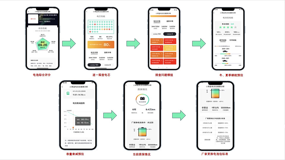 精准洞察电池包健康度|小黑盒为新能源二手车交易保驾护航🔥 小黑盒电池包健康诊断仪可测试包括特斯拉在内的超过200个纯电和插电混动品牌车型。 报告提供电池包综合性能评分,直观反映电池整体状况;车辆基础信息;在电芯性能方面,筛查良好电芯并计算良品比例,同时给出模组电压和温度的详细数据,帮助识别潜在问题模组;展示电池包性能表现,并预估在夏季和冬季的续航情况;利用大数据计算,分析电池的衰减趋势,提供更准确的电池性能预测;展示电池包的质保情况以及厂家更换标准。