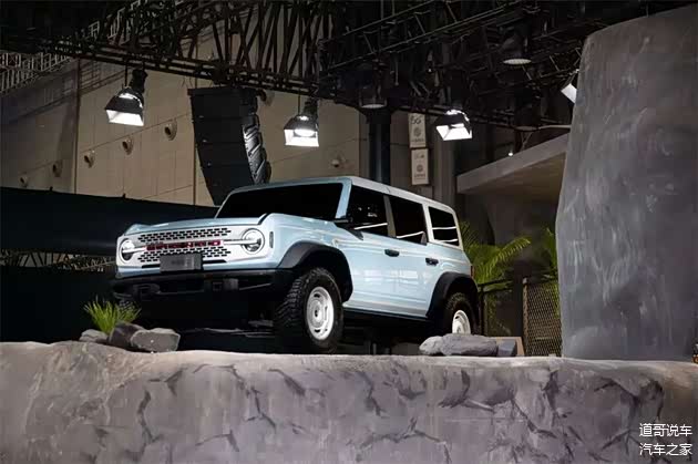 在这个展区中,烈马复古特别版被扔进人造岩石阵,车身涂成独具一格的知更鸟蛋蓝色(Robin's Egg Blue),复古轮毂泛着金属冷光。复刻了初代福特烈马的格栅设计风格的白色格栅和镶嵌着醒目的红色BRONCO字母标识搭配,演绎出专属的经典美学。