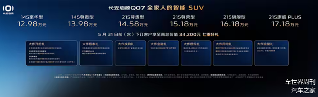 根据官方消息,长安启源Q07已经在车展正式上市,新车共推出包括215超长续航、145长续航两个版本在内的6款车型,售价区间为12.98-17.18万元。新车基于全新一代SDA全电平台打造,将配备包含天枢智能驾驶辅助在内的多项智能化科技配置,可以实现高速全量NOA。