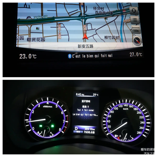 音源信息的显示也比较人性化,支持多种音源输入,在仪表盘和中控上半区都有歌曲信息的播放。