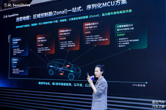 在区域控制领域,芯驰 E3 系列推出了以 E3650 为代表的高性能 MCU,满足车企对区域控制器(ZCU)的多样化需求,实现了车身、底盘、动力等系统的高效集成与控制。