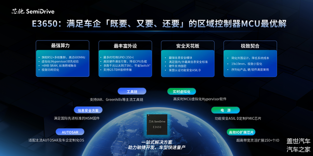 本次车展上,芯驰重点发布了E3650的一站式解决方案,加速车型敏捷开发、快速量产。方案创新配套: