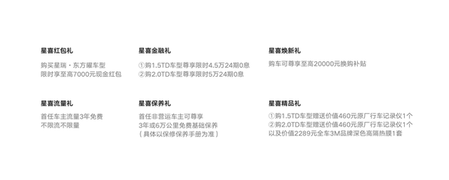 吉利星瑞·东方曜系列作为星瑞新款车型,在定价上也很有诚意。起步价只有9.97万,顶配也才13.87万。并且,还有很多优惠政策,例如至高7000元现金优惠、综合购车补贴、至高5万的两年零息金融等(具体请咨询当地门店)。可以说,定价门槛不高,就算是普通工薪阶层也能负担得起,也是很多年轻人、以及多人口家庭更容易接受的价格区间。