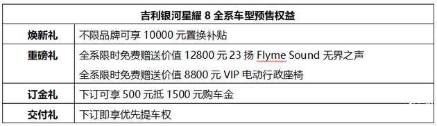 吉利银河星耀8新增的版型为60km EM-i 豪享版和130km EM-i 尊享版,两个版型均标配含ICC智慧辅助巡航、AEB自动紧急制动辅助等功能在内的“基础辅助驾驶”功能,预售指导价分别为13.38万元和14.38万元。同时,吉利银河星耀8在原有预售权益的基础上,新增10000元不限品牌置换补贴权益。