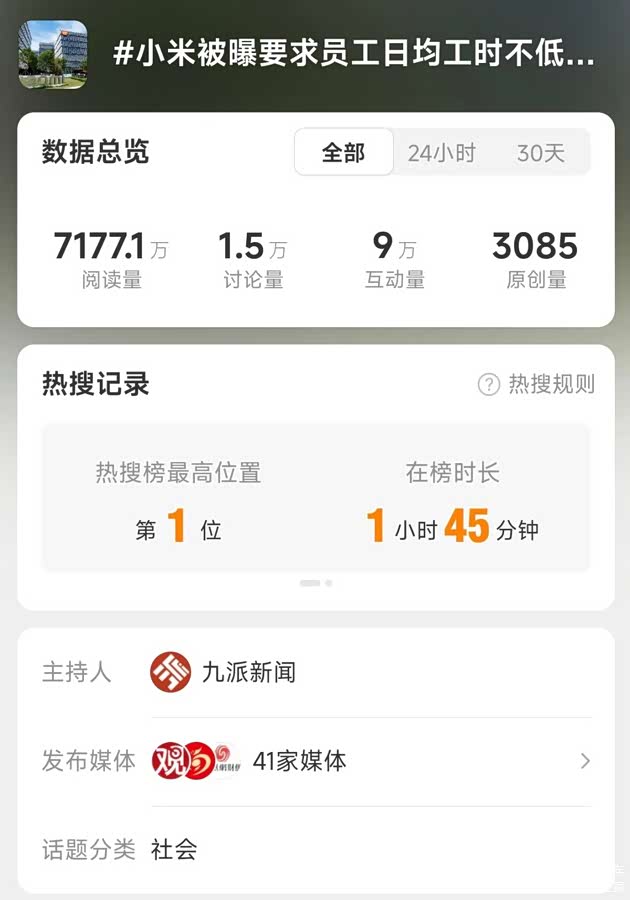 - 巧合的是,该热搜话题在4月24日晚小米发布红米新品turbo4Pro时登顶微博热搜第一,且话题阅读量来去迅速,因此也有人猜测存在狙击小米新品发布的嫌疑。此外,在相关热搜评论下,有人爆出九派新闻压榨实习生,甚至有人根据九派新闻发稿时间表,得出其日平均工时大于16.5小时的结论。目前,小米和相关部门尚未对此事作出回应。