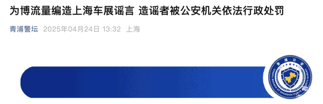 4月23日,上海市公安局青浦分局发布警情通报,一自媒体博主为博流量,故意张冠李戴发布涉及车展的不实信息,相关违法人员已被依法处以行政处罚。