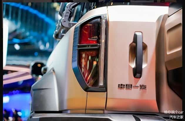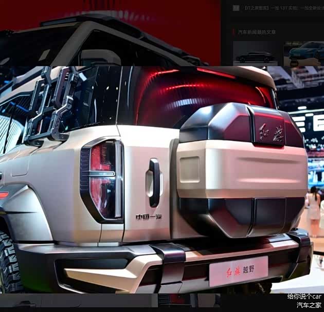 车尾部分,外挂式备胎、侧开式尾门以及纵向尾灯,这些都是当下硬派越野 SUV 常见的流行元素。从侧面看,车身造型方正,沙漠黄与黑色的涂装相得益彰,还配置了侧梯、车顶行李架、侧踏板以及粗壮的轮眉。而且,红色的红旗品牌设计元素在车辆的轮毂中央、轮眉等多个部位均有体现。