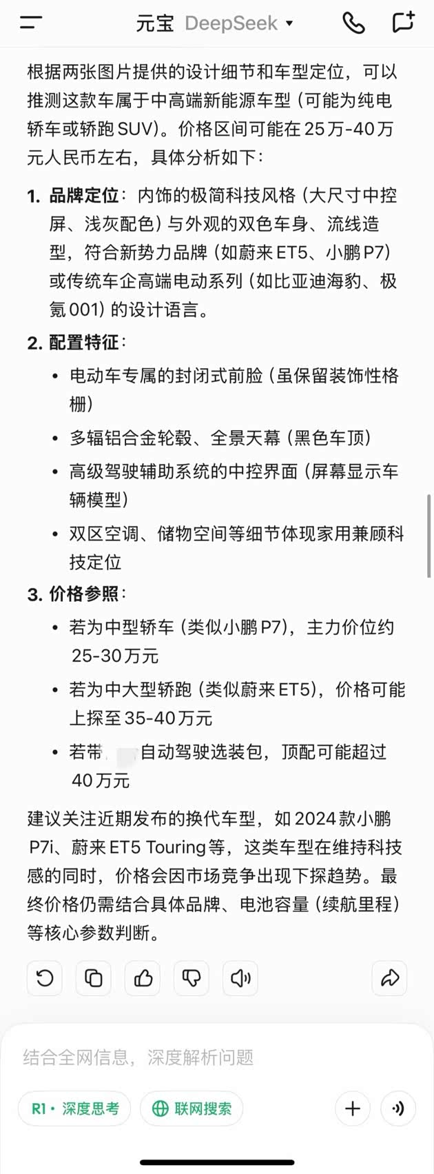 我将上海车展现场实拍的零跑B01外观和内饰图片遮住车标发给DeepSeek,并提问“结合我刚刚发给你的两张图片,猜猜这台车的价格?”没多久DeepSeek就给我一个很详实的回答,看到这个回答我还是很惊讶的!