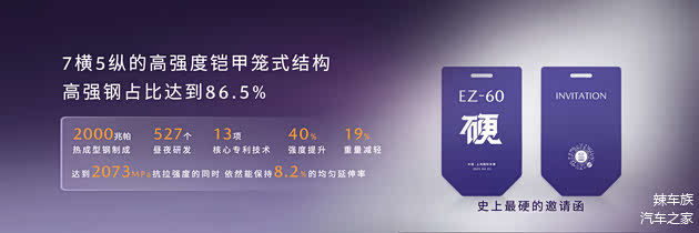 在安全性能方面,EZ-60延续了马自达在安全领域的核心DNA。全系标配9气囊,总容积高达370L,保护面积高达26,500cm²,同级领先。7横5纵的高强度铠甲笼式结构和占比达到86.5%的高强钢,为乘客提供了坚固的保护。此前,我们就收到了取自EZ-60车身2,000MPa热成型钢制成的“史上最硬的车展邀请函”。