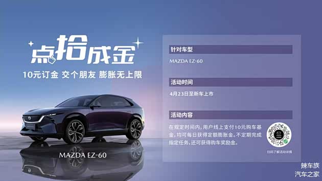 作为行业首个亮相即开启预订的车型,EZ-60推出了“点拾成金”的预订政策:订金10元,每天膨胀,膨胀不封顶,直至新车交付时膨胀金直接抵扣车款。即日起,国内消费者可通过长安马自达官网、「悦马星空」官方APP/小程序以及授权经销商预订新车,尊享智电豪华出行新时代。