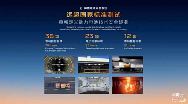 神盾金砖电池是吉利整合金砖电池与神盾短刀电池技术优势后的集大成之作。其核心在于“神盾”代表的极致安全体系与“金砖”象征的顶尖电芯技术融合。该电池需通过36项全场景极限测试,其中23项标准远超新国标,例如:电芯针刺测试:采用直径8mm钢针贯穿,全程不起火、不爆炸,温度低于40℃;海水浸泡测试:电池包需承受24小时浸泡(国标仅0.5小时),远超行业极限;底部安全测试:包括30km/h托底冲击、20km/h整车负坎冲击,实现“零损伤”,彻底解决电动车底部碰撞隐患。