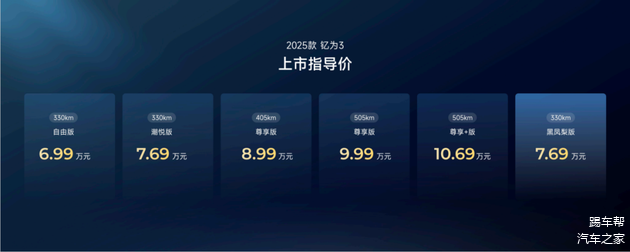 4月24日,江淮的纯电精品小车钇为3正式焕新上市,2025款共推出5个版本,售价6.99万元-10.69万元。5款常规版本外,钇为3还为个性化用户提供了“黑凤梨”趣改版,售价7.69万元。