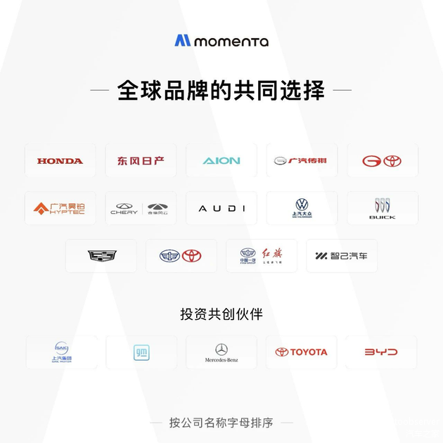 在短短三四天的时间里,Momenta以近乎每天两家的合作节奏,相继与通用别克、一汽丰田、本田中国、上汽奥迪、凯迪拉克和智己汽车六大品牌,共同发布新战略、新产品。至此,在全球TOP 10车企中,已经有7家世界巨头与Momenta建立了合作。