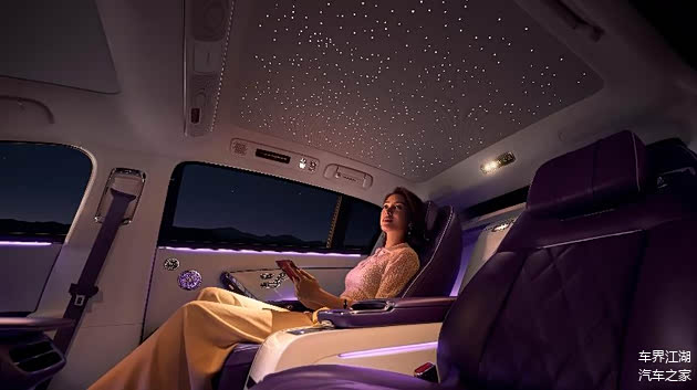 不过更具备科技浪漫仪式感的,还是它的智能星空穹顶设计,它由数百颗微型光源组成,可模拟浩瀚星空的浪漫景象,不仅能呈现繁星点点的静态美景,还能生动还原流星划过的动态瞬间,为乘客营造出无与伦比的奢享氛围。