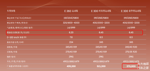 动力方面,新款 奔驰E级标准轴距版全系搭载带48伏ISG电机系统的2.0T发动机,传动系统匹配9速自动变速箱。其中,E 260运动版的发动机最大功率为150千瓦,峰值扭矩320牛·米,WLTC工况综合油耗由6.10升/百公里变更为6.20升/百公里;E 300时尚型运动版及E 300豪华型运动版的发动机最大功率为190千瓦,峰值扭矩400牛·米,WLTC工况综合油耗由6.40升/百公里变更为6.45升/百公里。