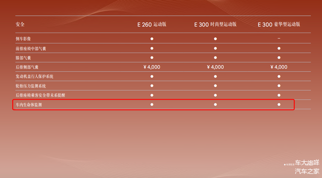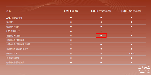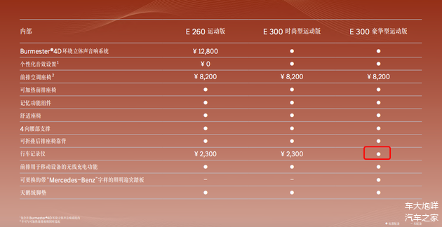 新款奔驰E级标准轴距版的功能配置水平进一步提升,全系引入车内生命体监测。在此基础上,E 300时尚型运动版新增标配智能数字大灯,定价保持不变;E 300豪华型运动版新增标配行车记录仪、MBUX智能人机交互系统实景穿越导航等,定价上调0.58万元。