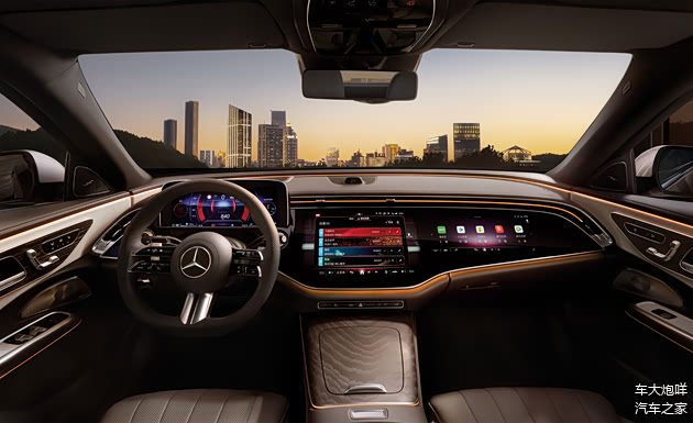 内饰方面,新款奔驰E级标准轴距版的设计风格同样没有变化,配备“双翼”造型的NAPPA皮饰多功能方向盘和悬浮式全液晶仪表,全系拥有第3代MBUX智能人机交互系统及高通骁龙8295芯片,其中E 300豪华型运动版默认搭载由14.4英寸中控屏与12.3英寸副驾屏组成的MBUX超级屏(其余车型选装价格1.66万元)。