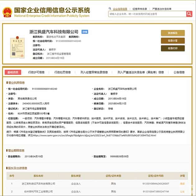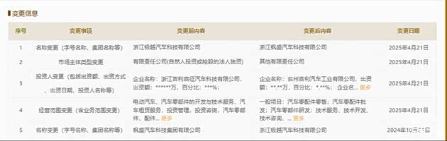 国家企业信用信息公示系统显示,浙江极越汽车科技有限公司发生工商变更,企业名称变更为浙江枫盛汽车科技有限公司,同时新增台州吉利汽车工业有限公司为股东。