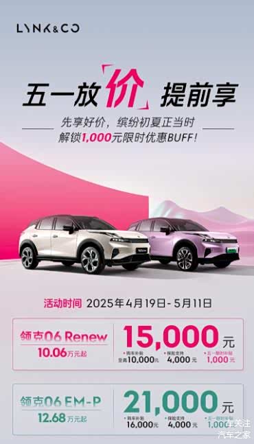 为迎接五一假期,领克06推出了限时补贴1000元的购车优惠活动。Renew起售价仅为10.06万元,EM-P起售价也仅为12.68万元。这一优惠政策无疑降低了消费者的购车门槛,让更多人能够轻松拥有这款集时尚、安全、智能于一体的车型。