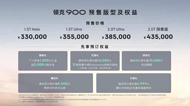 此外,领克900在价格权益上也诚意满满。预售价33万元起,预售期间下订并在2025年6月30(含)前完成提车的用户,还可至高享价值33999元的先享预订权益。