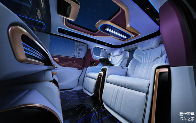 山河版车型内部采用围绕太空主题设计的沉浸式座舱布局,配备支持光影联动的顶部投影系统。车内星河穹顶具备光效与音乐同步能力,用于营造不同场景氛围,同时通过电动窗帘实现乘员隐私保护与迎宾交互联动。