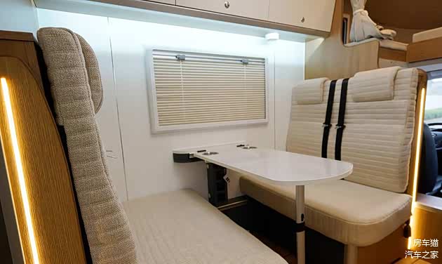 生活区是房车的重要组成部分,中间的桌板可拆卸拼成沙发床,进一步提升了空间的灵活性。客厅上方设有三个顶柜,增加了储物空间。