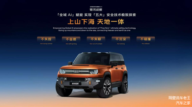 说到越野,银河战舰的“满血版AI数字底盘”绝对是个狠角色。它支持蟹行模式、原地掉头,甚至能实现“无人漂移”——没错,就是车子自己漂移,不用你操作。它的GVMC动态控制系统能让它在80km/h的麋鹿测试中稳如老狗,这个成绩在硬派SUV里已经是全球第一了。更夸张的是,它还具备800mm涉水深度,搭配车载声呐和浮水模式,能连续浮水2小时,航行速度达到8.5km/h(约4.6节)。这哪是SUV?这分明是辆水陆两栖战车!