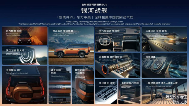 先说说外观,银河战舰走的是“方盒子”路线,这几年这种设计特别火,从路虎卫士到仰望U8,再到坦克系列,大家都喜欢这种硬朗风格。吉利这次的设计很聪明,既保留了硬派SUV的棱角,又融入了东方元素,比如前大灯灵感来自“浑天仪”,尾灯则像“天宫星轨”,整体看起来既霸气又有科技感。车尾还带了个小梯子和外挂备胎,车顶平台拓展性很强,一看就是为户外探险准备的。