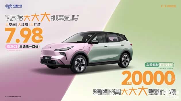 2025年上海车展如今正在火热进行中,各种新车层出不穷,看得人眼花缭乱。如果你预算七万多,想买一款纯电紧凑型SUV,给大家推荐一款车,叫做一汽奔腾悦意03。它刚刚推出了悦意03质选版,一口价7.98万,纯电续航445km,堪称上海车展的超人气SUV。