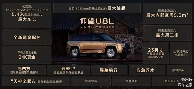在细节之处,仰望U8L同样彰显着豪华品质。车前后的甲骨文车标由24K真金打造,在灯光的照耀下熠熠生辉,尽显尊贵。其前脸设计灵感源自鼎,这一充满东方文化底蕴的设计元素,赋予了车辆独特的文化内涵。而且,车标所代表的甲骨文字,也为这款车增添了一丝神秘色彩,引发人们的好奇与遐想。