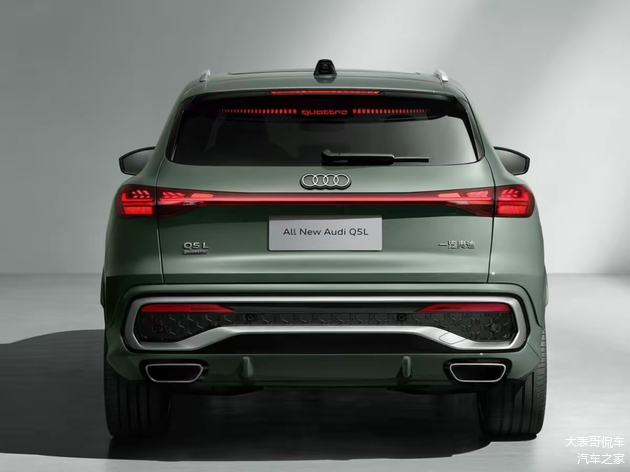 车尾部分,两边宽中间细的贯穿式的OLED尾灯组算是奥迪的一个特色了!双边共双出的不规则排气管并没有采用隐藏的设置。表明这是一台燃油车的同时也是更加的运动!尺寸方面,全新一代的奥迪Q5L车长4841mm,轴距为2946mm,相较于现款车型而言,均有了提升!