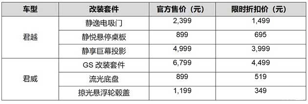 别克君越此次推出了三款改装件:静逸电吸门、静悦悬停桌板及静享巨幕投影。这三款改装件旨在提升车辆的豪华感和出行便利性,官方售价分别为2,399元、899元和4,999元,而在5月5日前购买还可享受限时折扣价1,499元、695元和3,999元。