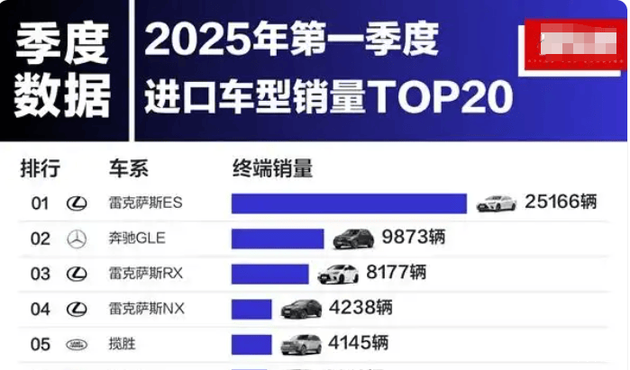 这种优势,一直延续到了2025年,今年一季度,进口车销量前20排行榜中,雷克萨斯继续以25166辆霸榜第一,同样将排在第二的奔驰GLE远远甩在身后。