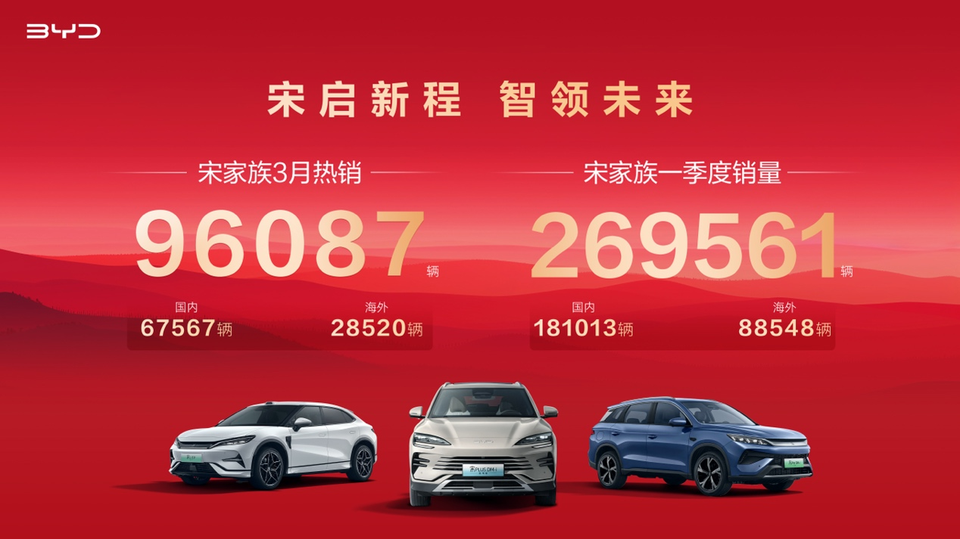 2025年3月,比亚迪宋家族以96087辆的耀眼销量,连续多月霸榜中国车企主流SUV家族市场销冠。不仅如此,宋家族一季度领跑SUV赛道,以总销量269561辆的战绩,在竞争激烈的SUV市场中强势领跑,成为汽车行业备受关注的标志性现象,充分彰显比亚迪在SUV领域的产品实力与技术底蕴。
