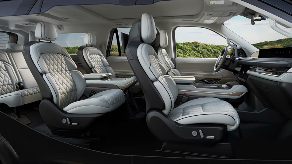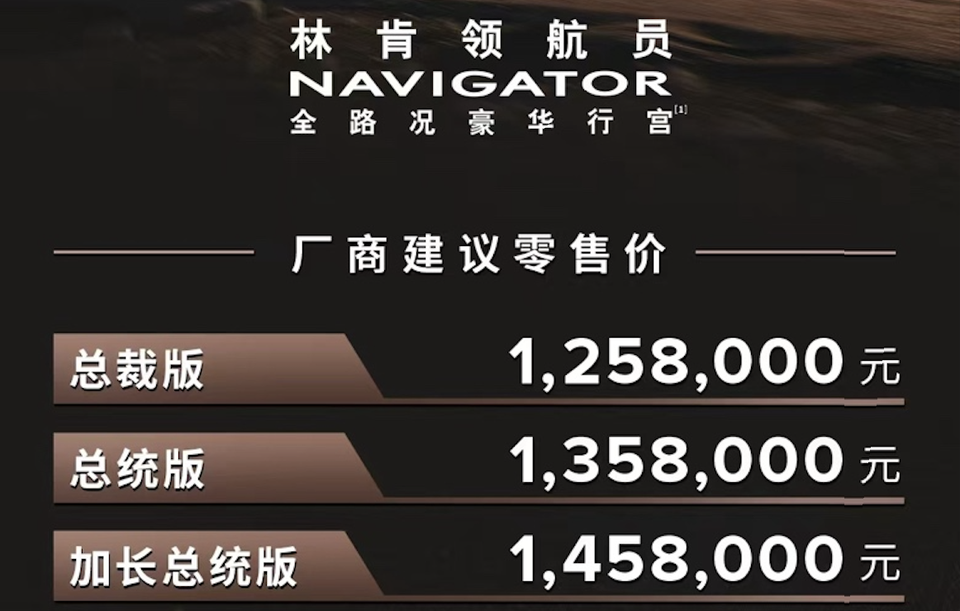 【全新一代林肯领航员首发限量版上海登陆】第二十一届上海国际汽车工业展览会于4月23日在国家会展中心(上海)盛大启幕。全新一代林肯领航员首发限量版正式上市,厂商建议零售价:1,258,000元-1,458,000元,车身尺寸方面,全新一代林肯领航员加长总统版长5.65米,宽2.07米,高1.98米,轴距达到3341mm,让MPV也相形见绌。坐进领航员,全车乘员均可拥有近2米的视线高度,行李厢容积最大可达1734升,近3平米的储物空间,全新一代林肯领航员拥有剧院包厢般的2-2-3格局,全部乘员都能享有领航者高坐姿与统帅者视野。 “七座皆上宾”的全新一代林肯领航员,重定七座格局,细琢豪华肌理,格局瞬间打开。前排领航座椅采用复式设计,主驾30向电动调节功能,可以满足对前后、靠背角度及腰托的各种需求,搭配加热、通风及按摩功能,无论何种身形都能找到最舒适的坐姿,享受最惬意的旅程。全球首款48英寸4K超清环抱巨幕横贯眼前。行驶中,车况及道路信息一览无余,5层结构声学玻璃,超过40个声学包及ANC主动降噪,营造如深海般的极致静谧体验,诠释“静谧之道”。配合28扬声器顶级锐威音响,唤回久违的松弛。3.5L V6双涡轮增压发动机,最大功率396马力,尽显“刚劲之道”。