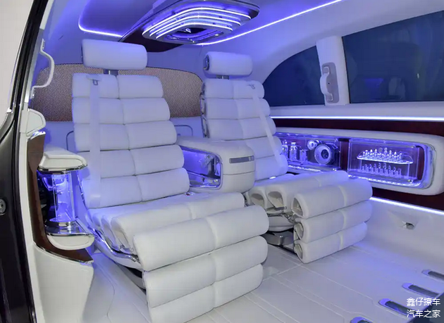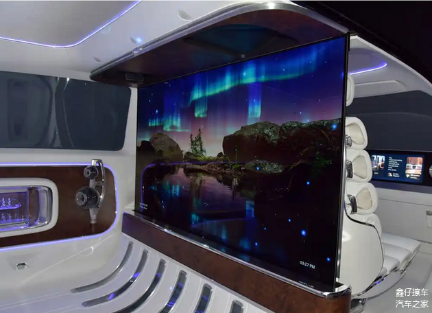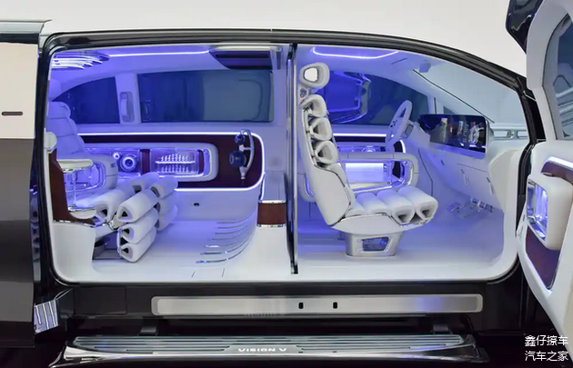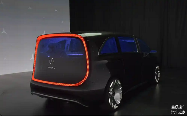 Vision V概念车的外观延续了奔驰当前的设计思路,前脸采用封闭式发光格栅设计,尾部灯组具有环绕式特点。内部座舱设计注重后排体验,配备了大尺寸显示屏、多扬声器音响系统,并应用了特定材质和座椅功能。