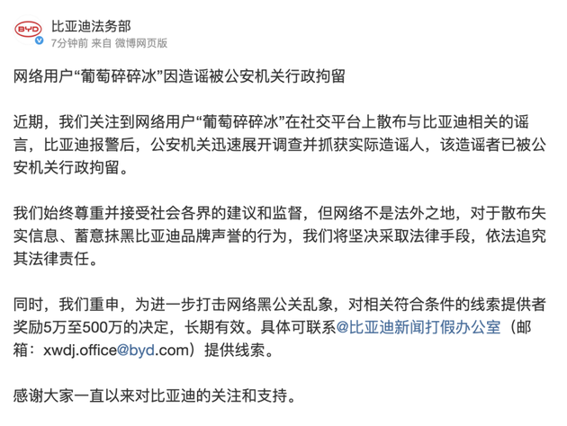 4月26日,比亚迪法务部发文称,近期,网络用户“葡萄碎碎冰”因散布与比亚迪相关的谣言,被公安机关依法进行行政拘留。