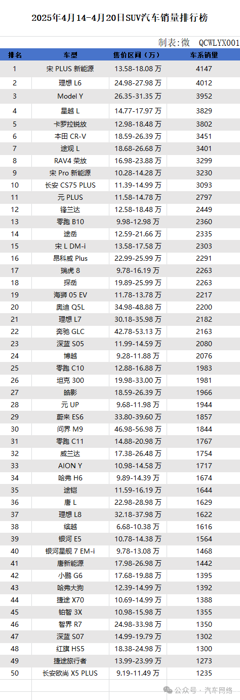 2025 年 4 月 14-4 月 20 日 SUV 汽车销量排行榜展现了当下汽车市场的动态与趋势。宋 PLUS 新能源以 4147 辆的成绩登顶,其 13.58-18.08 万元的定价精准契合主流消费区间,在汽车上牌数据中也占据显著比例,充分说明该车型在家庭用车市场的受欢迎程度。理想 L6、Model Y 紧随其后,分别以 4012 辆和 3952 辆的销量证明了中高端 SUV 市场的强劲需求,这些车型的热销对品牌的保有量数据增长起到关键作用。