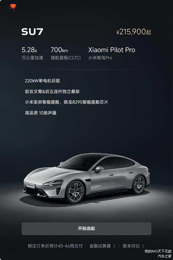 从消费者的等待时间来看,小米汽车的热销程度可见一斑。此前,小米汽车官网显示,小米SU7标准版的等车时间一度长达50周,目前虽有所缩短,但仍需43周至46周。即便是等车时间相对较短的小米SU7 Max,也需要36周到39周的时间才能交付。这进一步证明了小米汽车在消费者中的受欢迎程度。