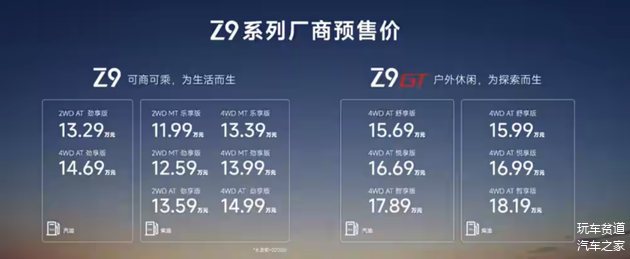 2025 款 GT 2.3T 自动柴油四驱悦享版:预售价 16.99 万元,动力与入门款一致。安全上增加了前排侧气囊、手机无线充电、主副驾座椅电动调节、前排座椅通风加热功能,前排车窗升级为双层隔音玻璃,静音性更佳,是最值得推荐的 Z9 GT 车型 。