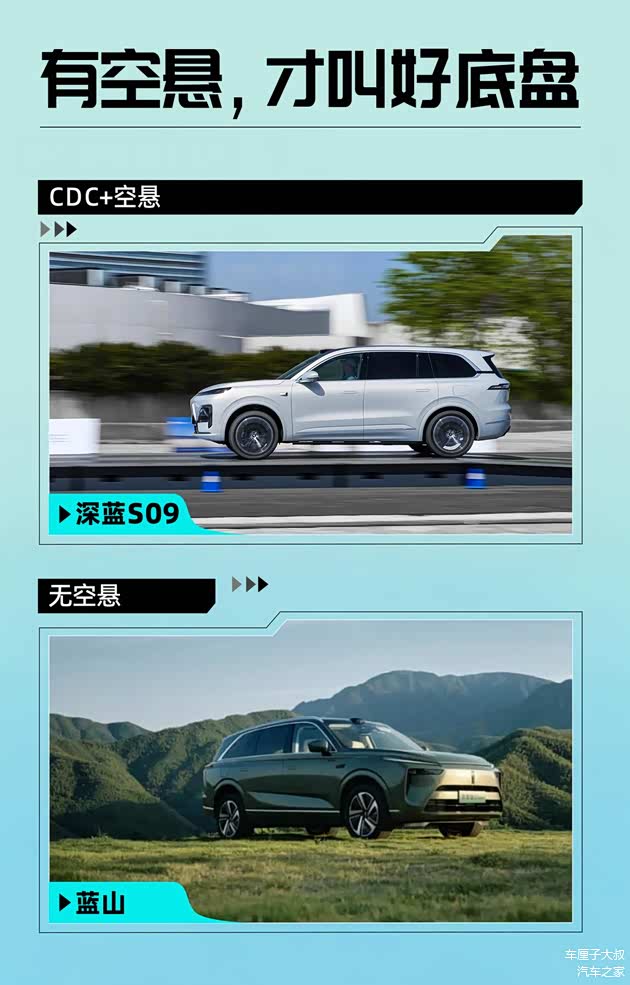 坦白来说,魏牌蓝山四驱智驾Ultra的麦弗逊+五连杆底盘放在2023年堪称扎实,但面对深蓝S09四驱Ultra+高定版的前双叉臂后H臂多连杆+CDC空悬+8液压衬套组合,瞬间暴露代差。在新能源大六座SUV车重本来就明显的情况下,要控制车身侧倾以及俯仰更是一门“技术活”。除了要滤震柔和让乘坐者和驾驶者感到舒适外,要做到起步不抬头、刹车不点头才能真正让整个A点到B点的行程舒适。