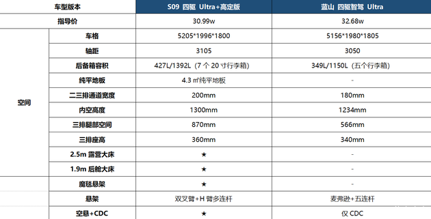 我们就拿两辆车的顶配车型(深蓝S09四驱Ultra+高定版与魏牌蓝山四驱智驾Ultra)相比,带你看清这两款车的核心差异: