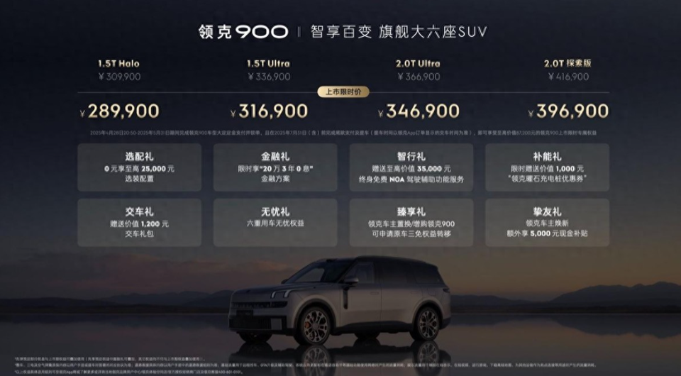 2025年4月28日,领克汽车旗下全新旗舰力作领克900正式上市,推出1.5T Halo、1.5T Ultra、2.0T Ultra 、2.0T探索版四大配置,限时售价28.99万元至39.69万元。