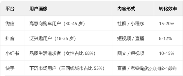 其实在社交媒体平台资源分配中,二手车商需构建包含用户匹配度、内容适配性、转化效率的评估模型。根据中国汽车流通协会2024年数据,不同平台的核心价值如下: