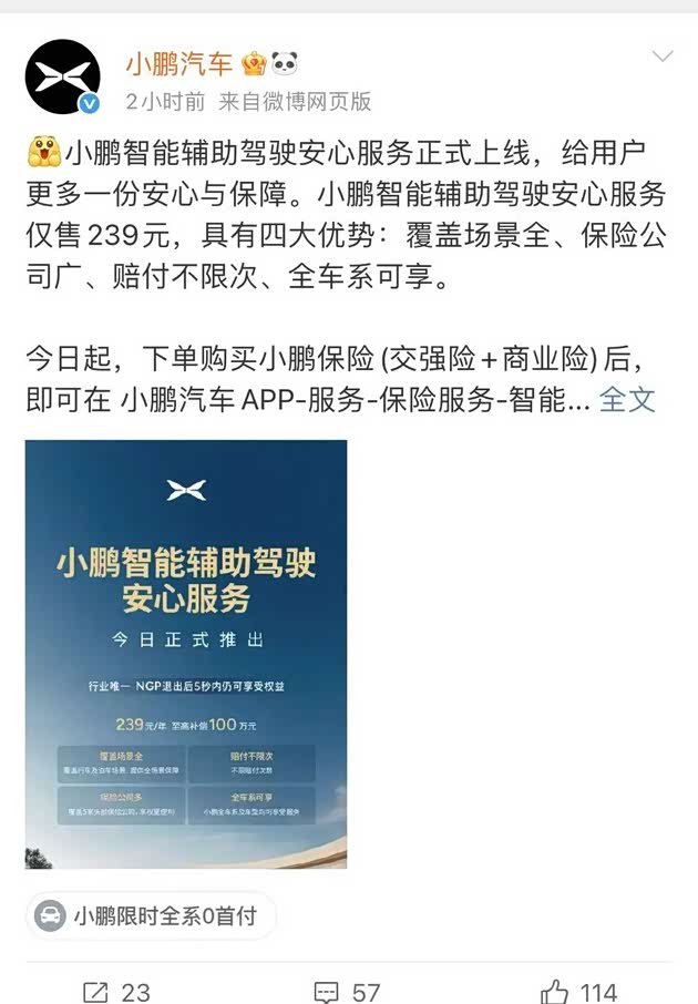 近日,小鹏汽车正式上线了一项名为"智能辅助驾驶安心服务"的创新保障计划,引发行业广泛关注。该服务以每年239元的亲民价格,为用户提供最高100万元的赔付保障,且不设赔付次数限制,成为业内首个覆盖全车系、全场景的智能驾驶专属服务方案。