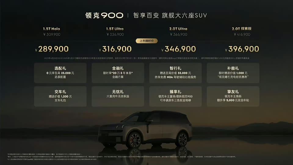 其实领克900,30.99-41.69万的价格并没有很炸裂,限时价格减掉的2万,其中还有1万是置换补贴, 一个月前预售的时候看过一次配置了,入门的1.5T Halo不值得入手, 主要是Ultra,还得是用了“逍遥超级增程电池”的2.0T Ultra。 正式上市一个小时,大定就超过了1万台,后发还是有优势的,接下来就看五一假期的了!